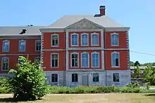 Up to the year 1192, the site was almost deserted.[2] The foundation of the abbey is attributed to Hugues de Pierrepont, Bishop of Liège, who in 1187 decided to establish Val-Saint-Lambert.[3] Construction began in 1202 after he gave a tract of land and woods situated in what was then called the Champ des Maures to a group of monks.[2][4] The abbey was a daughter house of Signy Abbey in Ardennes, France, which was a daughter house of Igny Abbey. Val-Saint-Lambert Abbey was inhabited by a religious community for centuries; it prospered and became powerful.[2] The abbey's chateau served as the summer palace of the Prince-Bishopric of Liège.[3] The abbot Simon de Harlez, Val-Saint-Lambert's sponsor, canon of St. Lambert's Cathedral, Liège, and adviser to the Prince-Bishop, began an expansion project in 1750, funded by his coal earnings.[5] It was completed before 1796 when the monks were expelled as a result of the French Revolution, at which time the buildings were demolished and the holdings were sold as public goods. In 1825, the abbey ruins were purchased by the chemist François Kemlin and the engineer Auguste Lelièvre, who converted the building into a glass works.[2] Since 1826, it has been used by the crystal manufacturer Val-Saint-Lambert. In 1846, Val Saint-Lambert merged with the Société Anonyme des Manufactures de Glaces.[6]