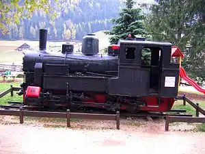 Locomotive no. R 410.004 (FS numbering) is preserved adjacent to the Railway Trail at Ortisei. It is an outside cylinder 0-8-0 well tank with outside frames which was built in 1916 by Krauss of Linz (works number 7174) as no. 4154 Class IVc for the KUK Heeresbahn (Austro-Hungarian Military Railways). It was one of seven similar locomotives which worked on the line.[7]