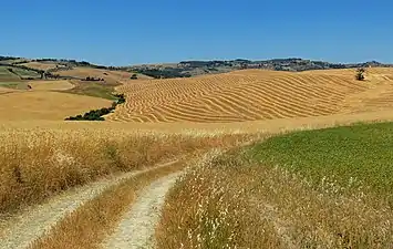 The Val d'Orcia or Valdorcia (Italian pronunciation: [valˈdortʃa]) is a region of Tuscany, central Italy, which extends from the hills south of Siena to Monte Amiata. Its gentle, cultivated hills are occasionally broken by gullies and by picturesque towns and villages such as Pienza (rebuilt as an "ideal town" in the 15th century under the patronage of Pope Pius II),[1] Radicofani (home to the notorious brigand-hero Ghino di Tacco) and Montalcino (the Brunello di Montalcino is counted among the most prestigious of Italian wines).[2] Its landscape has been depicted in works of art from Renaissance painting to modern photography.