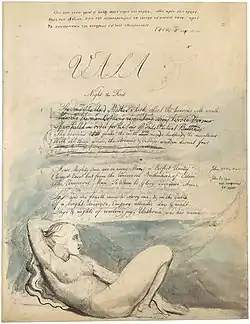 Like many of Blake's works, designs in Vala depict sexual activity or the genitals of the individual. Blake used these images as part of a general celebration of sex and sexuality. This emphasis on free sexuality occurs in The Marriage of Heaven and Hell, Visions of the Daughters of Albion, and Blake's designs based on the Book of Enoch. Blake's beliefs emphasised the need for sexual openness in relationships and the lack of jealousy. In Vala, the idea of jealousy is a central theme and one of the bases for the story.[7]