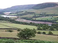 Valehouse (or Vale House) Reservoir is a man-made lake in Longdendale in north Derbyshire. It was built between 1865 and 1869 as part of the Longdendale chain, which was built to supply water from the River Etherow to the urban areas of Greater Manchester while maintaining a constant flow into the river.[1] The upper reservoirs supply the drinking water, while Vale House and Bottoms are compensation reservoirs which guarantee the flow of water to water-powered mills downstream.[2] Valehouse, with a crest elevation of 503 metres (1,650 ft), is too low to supply water under gravity to the Mottram tunnel, so could not be used as an impounding reservoir. Today 45 megalitres of compensation water are released each day into the River Etherow.[3]