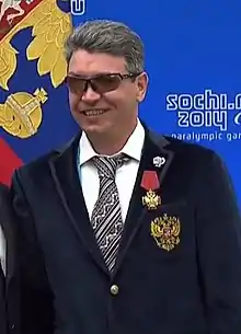 Valerii Redkozubov (also spelled Valery, Russian: Редкозубов, Валерий Анатольевич, born 20 July 1972) is a Russian male visually impaired Paralympic alpine skier. He has represented Russia at the Paralympics on 3 Winter Paralympic events in 2010, 2014 and 2018.[1] He was the flagbearer for Russia during the 2014 Winter Paralympics as he led the Russian Paralympic delegation in its home nation at the opening ceremony of the event.[2] He was awarded the Order "For Merit to the Fatherland" by the Russian President, Vladimir Putin in 2014 for his outstanding performance at the 2014 Winter Paralympics.[3] Valerii Redkozubov was also awarded the Medal of the Order "For Merit to the Fatherland" in March 2018 by Vladimir Putin after his impressive Paralympic record during the 2018 Winter Paralympics.[4]