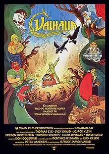Valhalla is a Danish animated feature film released in 1986 by Metronome, based on volumes one, four and five of the comics series of the same name, in its turn based on the Scandinavian tales of the Norse mythology, as they are told in Snorri Sturlusons so-called Younger Edda (c. 1230), and in the Poetic Edda. It was directed by Disney animator Jeffrey J. Varab and cartoonist Peter Madsen, the latter of which is one of the writers and the main artist on the Valhalla comics. The movie takes plot elements told from the three comic albums "Cry Wolf", "The Story of Quark" and "The Journey to Útgarða-Loki".