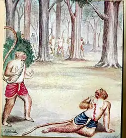 Vali (Sanskrit: वाली, nominative singular of the root वालिन् (Valin)), also known as Bali, was king of Kishkindha in the Hindu epic Ramayan. He was the husband of Tara, biological son of Vriksharaja, the elder brother of Sugriva and father of Angada. He was killed by Rama, an avatar of Vishnu. Vali was invincible during Treta Yuga. Vali defeated some of the greatest warriors like Ravana. Vali was blessed with the ability to obtain half the strength of his opponent. Rama killed Vali by hiding behind the trees. However, during his first attempt, Rama could not recognize which one is Vali and which Sugriva due to their similar looks. Thus, during the next attempt, Sugriva wore a garland of red flowers and went to battle with Vali. This time, Rama could recognize which was Vali and shot an arrow that killed him.[1]