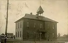 The first schoolhouse in Allen Township was a small log structure built in 1836. It was built of round logs covered with a clapboard roof, had greased paper windows and a huge fireplace at one end. About 1870 a two-room brick building was built on East Market Street. This building was later condemned and a four-room school was erected and used till 1917 when the schools of Allen Township were centralized and the present school, Van Buren High School, was erected.[5]