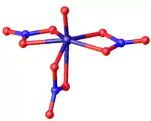 VO(NO3)3 has a distorted pentagonal bipyramid shape with idealized Cs (mirror) symmetry. The vanadium oxygen bond (157.2 pm) is typical for vanadyl(V). Two nitrate groups in the pentagonal plane are bidentate (V-O distances range from 199 to 206 pm). The third nitrate spans the pentagonal plane (197 pm) to the position trans to oxo (223 pm).[7][8]