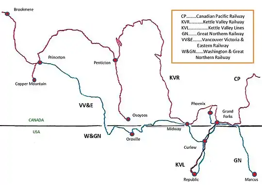 Under the VV&E charter for BC and the Washington and Great Northern Railway (W&GN) charter for Washington state, GN laid track northward from Marcus (WA),[9] reaching the site of the Laurier-Cascade Border Crossing in March 1902.[10] GN being the greater threat, CP allied with former foe the Kettle Valley Lines (KVL). The latter did all within its power to impede GN progress. Although incomplete, the KVL Grand Forks–Curlew (WA)–Republic (WA) route opened in April. The GN Marcus–south Grand Forks–Curlew–Republic service opened in July.[11] The GN spur, which forked to Columbia and the Granby Smelter,[12] opened in November.[13]