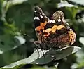 These are fast flying butterflies. Mainly found in open areas near the river in the mountainous jungle, they are also often seen on grass near roads or in the soil around the plant flowers sucking, honey, or they sitting on the ground basking in the sun.[6] Both male and female Indian red admiral can be seen around the hill nettle plant species. The male Indian red admiral encircles the female while the female goes around to lay eggs on leaves that are suitable. The male butterflies are territorial and they choose the places best suitable for mating. After selecting they fly around the place keeping a watch on the movements of the female. The males are generally aggressive and often seen fighting with other males. They show acrobatic techniques to attract the female's attention.[7]