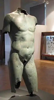 The fourth phase at Vani runs from c. 250 BC to c. 47 BC.[14] This was the period of relative decline in central Colchis: many settlements disappeared as did rich burials. The Vani site saw the erection of a strong circuit wall, with towers and a heavily defended gate,[16] built of mudbrick on a stone socle.[14] Around 150 BC, much of the city was destroyed as evidenced by dating the stamped Rhodian amphorae unearthed at Vani. By the end of the 2nd century BC, there was renewed building activity: parts of the ruins were methodically levelled and new buildings were constructed. The northern part of the hill was dominated by the gate and defensive structures and the lower terrace housed a large temple complex.[17] The large buildings of the city were decorated with Corinthian capitals and lion-head waterspouts. Hellenistic statues in bronze attest to the impact of Greek culture.[18] According to Lordkipanidze, Vani became a city-sanctuary similar to the temple communities of ancient Anatolia;[14] David Braund argues there is the lack of evidence and identification of the function of many buildings at Vani is problematic.[19]