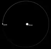 Using observations with the Hubble Space Telescope from 13 November 2005, Michael Brown and T. A. Suer detected a natural satellite.[1] The discovery of a satellite of Orcus was reported in an IAU Circular notice published on 22 February 2007.[2] The satellite was given the designation S/2005 (90482) 1 before later being named Vanth. It orbits Orcus in a nearly face-on circular orbit with an eccentricity of about 0.007, and an orbital period of 9.54 days.[8] Vanth orbits only 9,030 km (5,610 mi) from Orcus and is too close to Orcus for ground-based spectroscopy to determine the surface composition of the satellite.[7]
