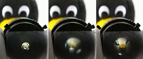 A varifocal lens is a camera lens with variable focal length in which focus changes as focal length (and magnification) changes, as compared to a parfocal ("true") zoom lens, which remains in focus as the lens zooms (focal length and magnification change). Many so-called "zoom" lenses, particularly in the case of fixed-lens cameras, are actually varifocal lenses,[1] which give lens designers more flexibility in optical design trade-offs (focal length range, maximum aperture, size, weight, cost) than parfocal zoom. These are practical because of autofocus, and because the camera processor can automatically adjust the lens to keep it in focus while changing focal length ("zooming") making it suitable for still photography where a change in magnification of the subject, as demonstrated below is not a problem. The change in the subject size is a significant problem in video and true parfocal designs are needed for higher quality video work. Varifocal lenses can be used for image display as well as capture, and Oculus VR has confirmed developing a varifocal display for virtual reality.[2]