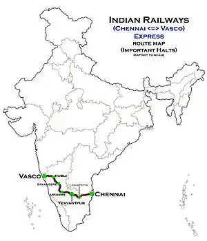 The Vasco da Gama–Chennai Express runs via Madgaon Junction, Castlerock, Hubli, Yesvantpur Junction to Chennai Central.