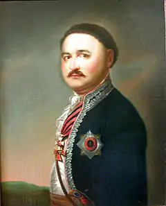 Vasily Petrovich Orlov (Russian: Орло́в, Васи́лий Петро́вич), was a Russian Full General of Cavalry. Hero of Russo-Turkish Wars of (1768–1774) and (1787–1792). Ataman of the Don Cossacks, received orders to command the Indian March of Paul in January 1801 from Emperor Paul I of Russia. His wife Daria Fedorovna, was a daughter of Ataman Count Fedor Petrovich Denisov and son of Vasily Petrovich Vasily Orlov-Denisov, a Don Cossacks General in honour of his grandfather Fedor Petrovich Denisov added his surname to his own, becoming count Orlov-Denisov on 26 April 1801.