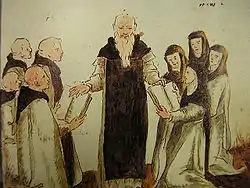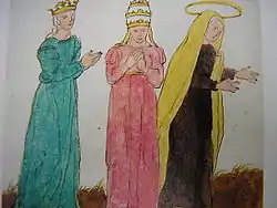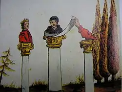 A postscript by Carthusian librarians states that the book had been presented by one Brother Beroaldus to cardinal Maffeo Barberini, who would later become Pope Urban VIII (1623–1644). A further covering note suggests that the images were by the French seer Nostradamus (1503–1566), and had been sent to Rome by his son César de Nostredame as a gift. There is, however, absolutely no contemporary evidence that Nostradamus himself was either a painter or the author of the work, whose contents in fact date from several centuries before his time—nor, indeed, that he had ever heard of it, given that it did not finally appear in print until after his death.[2] The postscript is in fact dated '1629', and the covering note (not in Nostradamus's hand) from which the Nostradamian title derives cannot, on the basis of its contents, date from earlier than 1689 – though an internal note does refer to a source dated 1343.[4]