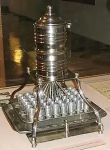 Vaughnsville's most unusual claim to fame is the first location in the World to use individual communion cups for the Lord's Supper. Though contested.[7] John G. Thomas—a physician and pastor of the Vaughnsville Congregational Church—designed a communion outfit after noticing "a communicant with a diseased mouth condition".[8] Thomas applied for a patent for his invention on August 2, 1893, in which he wrote that he "invented certain new and useful improvements in communion service" which would "provide an individual or separate cup for the use of each person at the celebration of the Lord’s Supper, commonly called the communion service…" (Serial No. 482,186). According to The Lima News, Thomas and his church elders first experimented with the individual cups "sometime during 1893" (January 16, 1955, p. 5B). The patent for his invention was granted on March 6, 1894, and marked the first time an individual cup service received letters patent in the United States (Patent No. 516,065). Thomas moved to Lima and started the Thomas Communion Service Company in 1893 and it was sold in 1972.