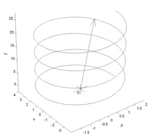 The vector shown in the graph to the right is the evaluation of the function near t =19.5 (between 6π and 6.5π; i.e., somewhat more than 3 rotations). The helix is the path traced by the tip of the vector as t increases from zero through 8π.