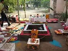 In the Agnicayana ritual, the mahavedi (great altar) has a length of 24 prakrama in the east, 30 in the west and 36 in the north and south.[2] Inside the mahavedi, an altar is placed. In the smaller ritual space to the west of the mahavedi (pracinavamsa, pragvamsa), three altars are placed: the garhapatya (earth, west), ahavaniya (sky, east) and daksinagni (or anvaharyapacana, southwest). The round garhapatya and the square ahavaniya have the same area.[3] The Squaring the circle problem was also investigated because of such ritualistic considerations.[4] The ahavaniya altar has five layers (citi), representing earth, space and the sky.