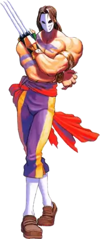 Vega was designed by Akira Yasuda with the premise of the original Street Fighter's Geki character in mind, and was initially conceived as a brief sketch of a masked man in a ripped shirt with long, frizzy hair.[3] As development progressed the design evolved into a large, unarmed man, retaining the mask and dressed as a matador. The design was changed again, revolving around the concept of a foreign soldier with a cross on his vest and armed with a broadsword, while still retaining the mask.[4] This design was eventually replaced in turn with another concept, a masked ninja in a bodysuit armed with a long metal claw on his right hand.[3] Ultimately the character's finalized appearance was a culmination of all of these, incorporating various aspects of each into the finished design.[5]