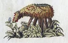 The Vegetable Lamb of Tartary (Latin: Agnus scythicus or Planta Tartarica Barometz[1]) is a legendary zoophyte of Central Asia, once believed to grow sheep as its fruit. It was believed the sheep were connected to the plant by an umbilical cord and grazed the land around the plant. When all accessible foliage was gone, both the plant and sheep died.