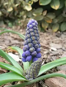A bulb of Muscari has reproduced vegetatively underground to make two bulbs, each of which produces a flower stem.