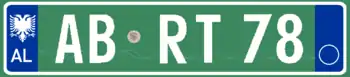 A new format similar to the post-1994 Italian and post-2009 French plate designs has been introduced since 16 February 2011.[1] The plates start with a blue strip at the left with 'AL' and redesigned double-headed eagle in white, 2 serial letters, security hologram, 3 digits, 2 serial letters on a rectangular white background, and end on the right with a blue strip that's supposed to show year of registration and regional code in white on. It has been observed that the last two identification elements are de facto not included while the font is more emphasized than the post-2002 one.[2] Plates of all vehicles would experience a similar change.[3] Critics claim that the color of the double headed eagle and strip is not representative of red and black colors of the Albanian flag.