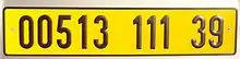 Standard issue plates are white with black digits (affixed to the front of the vehicle) and yellow with black digits (mounted onto the rear of the vehicle). Being composed solely of numbers, they are one of the few vehicle registration plates which can accurately be referred to as 'number plates'.