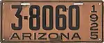 1925 | Embossed black serial on copper plate with border line; "ARIZONA" at bottom, offset to left; vertical "1925" at right | none | 1-12345 10-1234 |