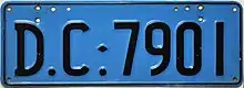 Diplomatic plates are issued to foreign diplomats by the Government of the Australian Capital Territory. They would formerly grant diplomatic immunity to the vehicle and driver from all traffic laws, speed limits, parking infringements and tolls in all reasonable course of duty by a diplomatic officer, in compliance with international treaty, but this is no longer the case.[10] They follow the format of 'DC nnnn', 'DCnnnnn', 'DX nnnn' or 'DXnnnnn', where the first two or three numbers are the code for the home country of the diplomat, and have black text on a powder blue background. DC plates are issued to members of the diplomatic corps, whereas DX plates are issued to persons who are attached to diplomatic missions but are not themselves diplomats, e.g. household staff.