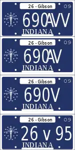 In each county, serials consisted of the prefix followed by one letter and up to four digits, progressing sequentially. In 1992, Allen County reached 2Z9999 and subsequently introduced a new format with the prefix followed by two letters and three digits (beginning with 2AA101); this format was later used in St. Joseph (71), Hamilton (29), Elkhart (20) and Vanderburgh (82) Counties.[9][10]