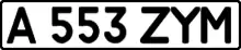 This format of Vehicle registration plates of Kazakhstan used black letters on a white background. Each registration plate consisted of a single letter identifying the area and three digits and two letters identifying the non-individual car (for example: A 001 AA) or of a single letter identifying the area and three digits and three letters identifying the individual car (for example: A 585 CUO)