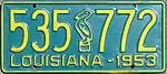 1953 | Embossed yellow serial with pelican separator on green plate with border line; "LOUISIANA-1953" at bottom | none | 123-456 | 1-001 to approximately 638-000 | |