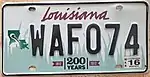 January 3, 2011 – December 31, 2012[4] | Embossed black serial on reflective white plate with pale green grass graphic and black border line; white pelican within green state shape screened at left; "Louisiana" screened in red handwritten font centered at top | "200 YEARS" screened in black centered at bottom, with "1812" and "2012" on small red banners at left and right respectively | ABC123 | VCT000 to approximately WUG999 | Limited-run plate to commemorate 200 years of statehood. Pelican and state shape later reduced in size. |