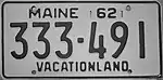 1962 | Embossed black serial on reflective white plate with border line; "MAINE 62" at top, offset to left, with metal tab slots either side of year | "VACATIONLAND" centered at bottom | 123-456 | 1 to 384-000 |