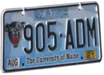 Black Bear | November 3, 2003 – present | Embossed black serial on white and pale blue gradient plate with border line; logo of the Maine Black Bears screened at left; "MAINE" screened in light blue centered at top | Light blue band screened at bottom with "The University of Maine" in black in the center | ACA–ADZ | Proceeds go towards the Maine Black Bears Scholarship Fund. |