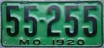 1920 | Embossed black serial on light green plate with border line; "MO. 1920" centered at bottom | 123-456 | 1 to approximately 309-000 | |