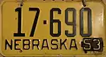 1952–53 | Black on golden yellow; "NEBRASKA 52" at bottom | none | 1-12345 10-12345 |
