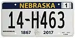 January 2017 – present | Black on reflective white with Sower statue from the Nebraska State Capitol; state name in gold on navy blue bar at top | "1867" and "2017" | ABC 123 | Early 'U' series to WYL 673 (as of February 23, 2022) | Commemorates Nebraska's 150 years of statehood. |