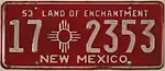 1953 | Embossed white serial with Zia sun symbol separator on red plate with border line; "NEW MEXICO" centered at bottom; "53" at top left | "LAND OF ENCHANTMENT" at top, offset to right | 1-12345 10-1234 |