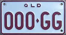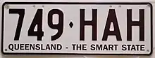The Australian state of Queensland requires its residents to register their motor vehicles and display vehicle registration plates.[1] Current regular issue plates are to the standard Australian dimensions of 372 mm (14.6 in) in length by 134 mm (5.3 in) in height, and use standard Australian serial dies.[2]