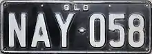 Once the aaa·nnn format between NAA·000 and PZZ·999 was exhausted, Queensland reversed the order to nnn·aaa, starting 1 July 1977.[3] These plates were issued with green text on a white reflective background and bore the slogan Queensland – Sunshine State.[3] As such Queensland became the second jurisdiction in Australia to issue sloganised plates.[3] This series started at 000·NAA and spanned through to 999·PZZ.[4] After exhausting this initial allocation, in late 1987, Queensland began issuing combinations from 000·AAA onwards.