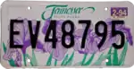 State Parks | 1993 | Embossed black serial on white plate. "Tennessee State Parks" screened at top in green with purple wildflowers screened in background. | EV12345 | Font used for "Tennessee" script same as the one used on roadside state border sign. Sample at left also carries curious single month-year validation sticker, seen only in 1994 and only on select plates. | |