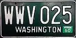 1958–62 | Embossed white serial on green plate with border line; "WASHINGTON" centered at bottom | none | ABC 123 | County-coded | Validated each year with plate stickers. |