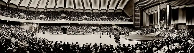 In the first part of the 20th century, the ball was held at the St. Louis Coliseum. Beginning in 1936 it was held at the Municipal Auditorium (which had been renamed the Kiel Auditorium)[3] until a lawsuit was brought against the Veiled Prophet organization for shutting down the public auditorium for weeks at a time, arguing that the common taxpayers did not have access to the event.[53] In the 1950s, the Chase Park Plaza Hotel constructed the opulent Khorassan Ballroom specifically to host the annual debutante ball, and the event was formally moved to the Chase Park Plaza Hotel in December 1975.[54]