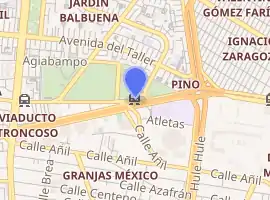 Velódromo is an elevated station[4] built at the portion of Line 9 that branches away from Viaducto Río de La Piedad to follow Eje 3 Sur (Avenida Morelos) when travelling west toward Metro Tacubaya. The station opened on 26 August 1987.[4] The logo for the station shows the silhouette of a bicycle racer.[2] It serves the Colonia Jardín Balbuena and the Granjas México neighborhoods.[2]