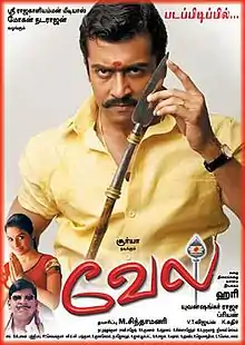 Vel (transl. Spear) is a 2007 Indian Tamil-language action film written and directed by Hari and produced by Mohan Natarajan. It stars Suriya, Asin and Kalabhavan Mani. Suriya plays a dual role as identical twins. The film also features Vadivelu, Lakshmi, Saranya Ponvannan, Charan Raj, Ambika, and Nassar in supporting roles.[1] The film's score and soundtrack was composed by Yuvan Shankar Raja.[2] Priyan handled the cinematography, while V. T. Vijayan handled the editing. The film released on 8 November 2007, coinciding with Diwali.