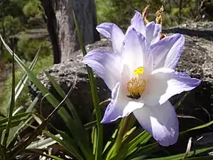 In the majority of Velloziaceae flowers are single or sometimes collected in bracts. There is no definite flowering period. They[6] are hypanthium-forming, sometimes papillate at their base or smooth, mostly white, creme or colored in different shades of purple although species with yellow, orange or red flowers also exist. Despite stricter, their structure is quite variable in some aspects (the number and structure of stamens varies at very high rate) as in other members of Pandanales. Tepals are six. The ovary is divided into three chambers with many ovules developed in them. Pistil and Stigma are also divided into three parts.