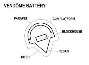 Vendôme Battery was one of the largest batteries to be built in Malta.[4] It has a semi-circular gun platform, having a parapet with nine embrasures. A blockhouse is located at the centre of the battery, and its land front contains a large redan. The entire structure is surrounded by a ditch and glacis.