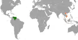 Venezuela and Vietnam established diplomatic links on December 8, 1989.[1] Vietnam has an embassy in Caracas and Venezuela has an embassy in Hanoi. Though bilateral trade was US$11.7 million in 2007,[2] relations show "great potential".[3] Since 2008, the two countries have witnessed new developments in various fields, including politics, economics, culture and society, particularly in the oil and gas industry.[4]