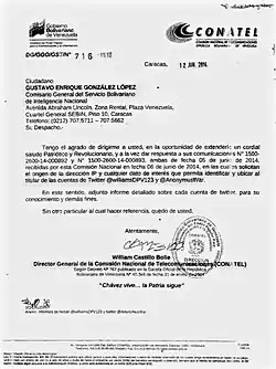 - "Empresa de telecomunicaciones de Venezuela niega bloqueo de Twitter". El Tiempo. 14 February 2014. Archived from the original on 4 May 2014. Retrieved 4 May 2014.