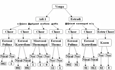 Venpa or Venba (வெண்பா in Tamil) is a form of classical Tamil poetry. Classical Tamil poetry has been classified based upon the rules of metric prosody.[1] Such rules form a context-free grammar. Every venba consists of between two and twelve lines. The venpa meter is used in songs of the types neṭu veṇ pāṭṭu ('long song in venpa meter'), kuṟu veṇ pāṭṭu 'short song in venpa meter', kaikkiḷai "one-sided love," and paripāṭṭu 'song that is quite accommodative' and in satirical compositions (aṅkatac ceyyuḷ).[2]